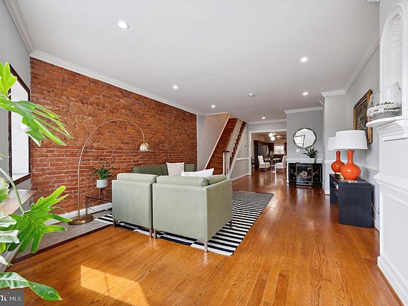 Get the space of a three-story house without hauling up and down two flights of stairs—the extra-wide, extra-deep footprint of this home provides a super spacious open-plan first floor and four true bedrooms all on one upper floor. It’s been recently renovated, and great details like custom windowsills, crown molding with decorative corbels and a unique curved niche provide architectural interest and set it apart from your run-of-the-mill rowhome. Oak floors and high ceilings run throughout the airy, freshly painted interior. On the main floor there’s an exposed brick wall, crown molding and chair rail in the living room, which flows into the equally spacious dining room and kitchen. The huge L-shaped kitchen offers classic raised-panel solid wood cabinets, granite countertops with undermount sink and gooseneck faucet, a black GE Artistry range and Samsung stainless steel dual-drawer French door fridge and Whirlpool dishwasher. And thanks to the home’s gracious space, the large powder room on this level doesn’t encroach on any other rooms. Up the staircase with a period-appropriate turned wood banister, the two middle bedrooms each have a full-size closet and window; the rear bedroom is a bit larger and has great western light from two windows; and past a double closet in the hall, the uber-charming front room is the clear choice for a primary bedroom. The unique shape of the room creates a perfect niche for a dresser next to the large closet with built-in organizer, and the crown molding and picture rail are the perfect extra touches. A stylish ceramic tile bath features a large vanity and a full-wall elongated subway tile surround with three Escher-inspired soap niches for the extra-deep soaking tub. A sweet unpainted original beveled glass door leads to the basement with a second full bath and laundry, and out back is a good-sized patio with breezeway. There’s a nicely landscaped bike share location on the triangle directly across the street, plenty of walkable parks and dining options, and tons of new construction on surrounding blocks. And the cherry on top: You can catch a view of the skyline from just outside your front door in this booming section of Point Breeze.