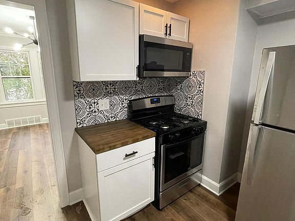 Modern finishesStylish chandelierQuiet streetUpdated bathroomStainless steel appliancesWarm wood countertop sectionBuilt-in corner cabinets