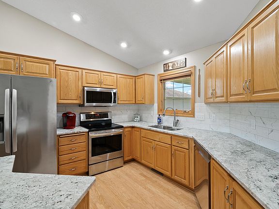 Rare opportunity to own this gorgeous end-unit townhome with all living facilities on one level that overlooks private wetland views. You'll be welcomed by a large patio and step into a sprawling living space with vaulted ceilings and ample windows that bring in an abundance of natural light. The kitchen features hardwood floors, a center island, stainless steel appliances, granite countertops and a tiled backsplash. Enjoy reading in the 4-season porch cuddled up next to the fireplace and watching wildlife from the maintenance-free deck. The large primary bedroom includes a walk-in-closet and a private full bathroom with a tub and double vanity. The main level also features another bedroom/office, 3/4 bathroom, a large hallway closet and laundry room. The walk-out basement includes a spacious family room with new carpet and a built-in wet bar, a bedroom with a walk-in closet, a 3/4 bathroom with a custom tiled shower and a huge mechanical room! Don't miss seeing this one!