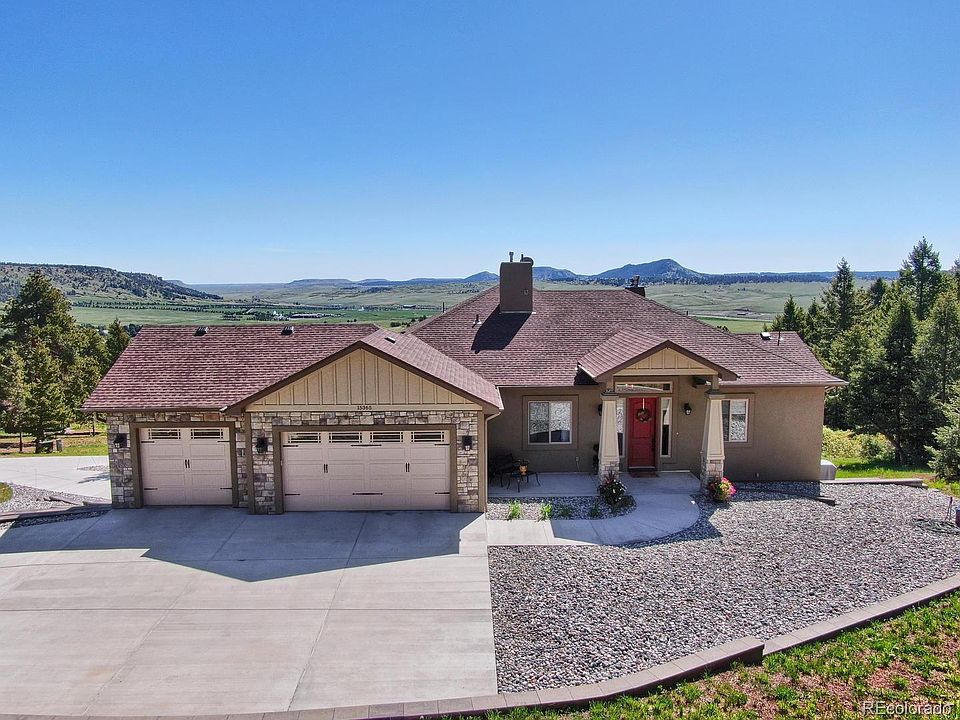 Builder's own dream home with amazing views! 38.73 acre parcel goes west, far behind the home site, over the top of the mountain in back! Low maintenance living, expansive views w/loads of privacy. Interior features include hand trowel textured walls & soaring 12' ceilings. Great room w/ brick fireplace is open to gourmet kitchen w/ huge island & veggie sink, quartz counters, subway tile back splash & farm sink. Walk out to patio with surround sound & gas stub ready to add grill/fire pit for the best in outdoor living. Main level owners retreat with soaking tub & custom tile/quartz. Lower level features 10' ceilings & two walk out sliding doors with a driveway leading up to the doors for easy access. Two large bedrooms feature a window seat and Jack n Jill bath. Separate game & rec room areas with a wood burning stove. 3 car garage (894 SF) on main level & 3 car tandem in lower level (840 SF) plus 3 one car detached garages currently used as sheds. RV or trailer parking. The options for a work shop or car storage are endless! Bring your horses or livestock & chickens. Up to 3 residences allowed on this property. Water rights and well permit allows for outside irrigation and watering of animals. Some families in the area have their kids enrolled in Lewis Palmer SD #38. Too many features to list! The modern farmhouse motif should be featured on the cover of a Colorado Home & Lifestyle magazine! Feels like you are worlds away yet just minutes to I-25 or Monument. Don't miss this one of a kind opportunity!