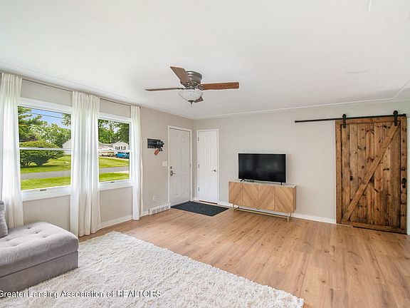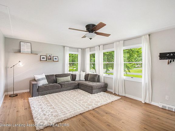 This beautifully updated ranch in DeWitt Township sits on a desirable corner lot in a quiet, established neighborhood. Enjoy new laminate flooring in the living and dining areas, plush new carpet in all bedrooms, and a neutral, cohesive design that feels like home. The finished basement features a spacious second living area and a fourth bedroom with egress?perfect for guests, a home office, or playroom. Step outside to a private, tree-lined backyard with a deck ideal for entertaining or relaxing. Mature trees add charm and privacy, while the 2-car garage and generous storage space make daily living easy. This turn-key home is ready to welcome you!