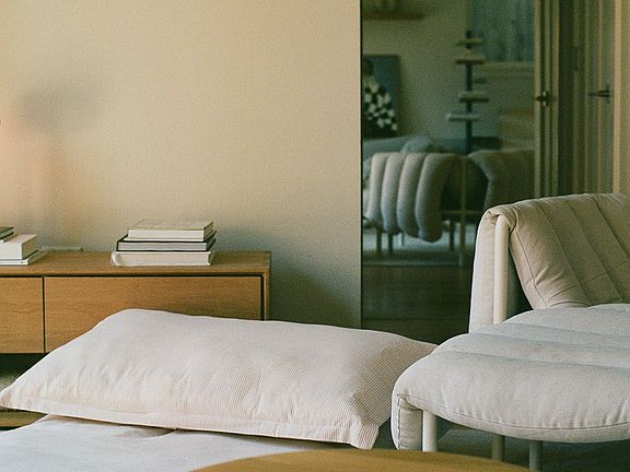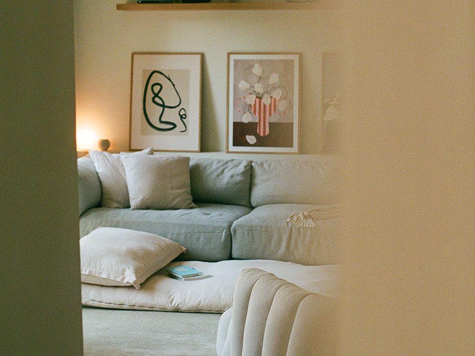 - Living Room: Sofa, armchair, coffee table, media console, and Samsung Smart Frame TV