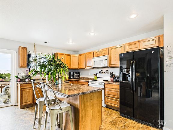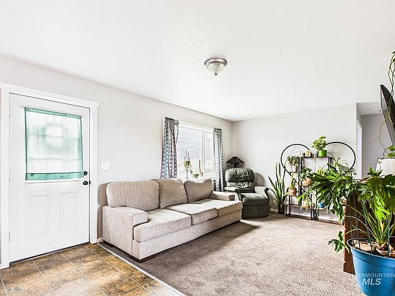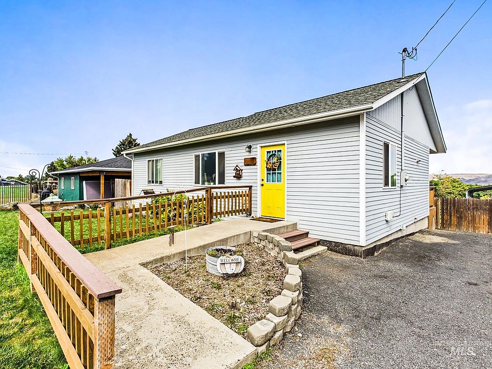 The Alder Avenue Lookout—a 2017-built 2 bed / 2 bath / 1,020 sq ft single level home set in The Lewiston Orchards. Enjoy privacy with no backyard neighbors and clear views from the deck. Inside, an open-concept living/kitchen/dining layout maximizes space and light. The primary suite includes an en suite bath; a second bedroom and full bath offer flexible use for guests or office. Outside, the good-sized lot provides room for a future shop plus an existing covered outbuilding for parking your toys. Thoughtful 2017 construction means low-maintenance living so you can spend more time enjoying the view. This is the perfect property if you are looking to downsize or buy your first home! A cheerful yellow front door adds instant curb appeal—move-in ready and easy to love.