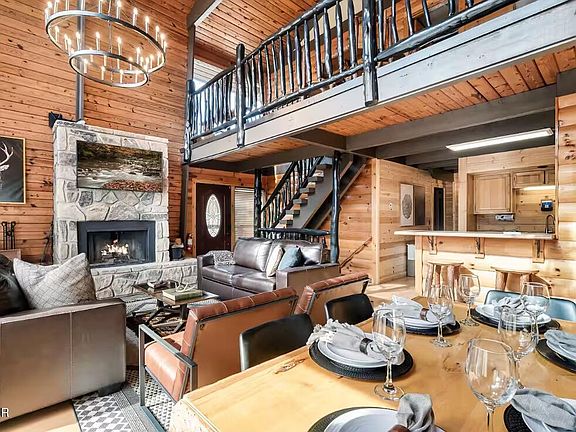 Step inside to find wood tongue-and-groove throughout, accented with striking black beams for a cozy-yet-modern cabin feel. The main level features a wrap around deck, soaring vaulted ceilings, a dramatic wall of windows, and an inviting wood-burning fireplace that anchors the open-concept living, dining, and kitchen area. The kitchen shines with beautiful hickory cabinets and stainless steel appliances, offering plenty of space to cook, gather, and entertain.