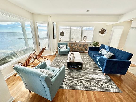 This gorgeous, direct ocean front, beach front 3-bedroom 2-bath house is a dream home in Clinton, on the Connecticut shoreline. The home is fully furnished and beautifully decorated. It is an escape by the sea, with gorgeous sunrises and stunning sunsets, sure to take you away from the mundane and daily grind.