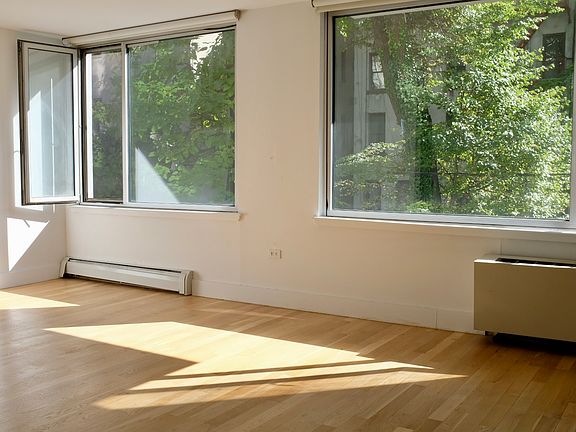 This fabulous alcove studio offers abundant natural light, 9'4" ceilings, and oversized windows framing serene garden views. The open layout features solid oak floors, a large closet, and an in-unit washer/dryer for modern convenience.
