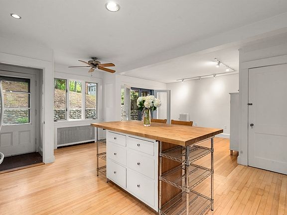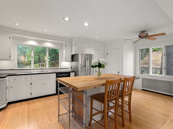 Welcome to 154 Beaumont Avenue, a storybook bungalow nestled on nearly half an acre of stunning wooded land in the heart of Newton.The main level showcases an open kitchen with a spacious eat-in area, abundant natural light, SS appliances, and French doors that open to a brand new stone patio. The inviting living room, with a fireplace and beautiful large windows, connects to the dining room, providing a perfect setting for entertaining. First floor primary suite boasts a full bath, walk-in-closet, and direct access to an enclosed patio. The dedicated home office is ideal for remote work or creative endeavors. Upstairs, find two bedrooms, a second full bath, an oversized closet, and ample storage. The lower level includes a rec room, laundry, and unfinished storage w/ exterior access. A detached 2-car garage is located off of Beaumont Ave., and additional parking is available behind the home. This expansive property presents significant opportunities for further development.