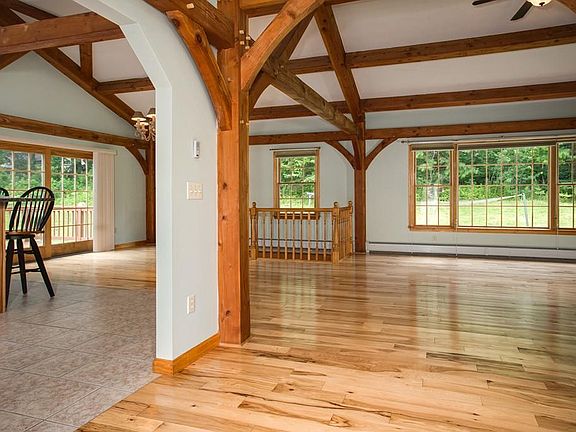 This amazing 2 bedroom ranch is like nothing you have ever seen! Exposed Post & Beams fill this spacious home offering an awesome open floor plan! The huge kitchen has new granite counter tops, a breakfast bar, beautiful hickory cabinets and a new farmer's kitchen sink! Recessed lighting and Jenn-Air Oven too! This is the perfect kitchen for entertaining and cooks! Open living room boasts a beautiful stone fireplace, ceiling fan and hickory flooring. Tons of windows and a slider off the dining area to a side deck. Large Master Bedroom offers a spacious bathroom, ceiling fan and huge walk-in closet. Andersen Windows adorned with Hunter Douglas blinds are featured throughout this home as well! The entire house has been freshly painted, a new boiler was installed along with new toilets and new gutters. Huge basement great for storage or for future finishing. Go see now or come to the open house Sunday July 2nd 12-2pm! Don't miss this house!