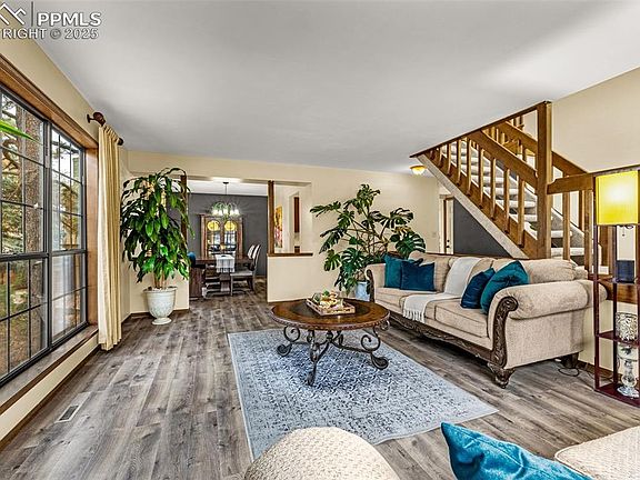 Welcome to Golden Hills in Rockrimmon, one of the most sought after neighborhoods in Co Springs where peaceful surroundings and modern living come together. The beautifully updated 5-bed, 3-bath home offers the perfect blend of comfort and sustainability, featuring paid off solar panels and upgrades throughout. Step inside to find a light-filled entry with skylight and vaulted ceilings. The living room and dining room have new LVP flooring and windows galore. The kitchen has newer stainless steel appliances, a sunny window over the sink, faucet with temperature sensitive lighting and a breakfast nook opening to the fenced yard. Step outside to entertain at the stuccoed built-in kitchen with Cal-Flame gas grill and refrigerator. Head back inside and upstairs to the four bedrooms and two baths - including a HUGE primary bedroom with custom walk-in closet and ensuite bath The finished basement is a true retreat with gas fireplace, walk-out to the forested backyard, bedroom, bathroom, laundry and additional storage room with shelving and beverage fridge. Two new composite decks on the front porch or on the private side yard offer tranquil havens for your morning coffee and deer watching. The 2 car oversized garage includes shelving and space for extra storage. This home has all of the upgrades with PAID OFF solar panels, a 200 amp electrical system, new circular driveway, freshly painted exterior, newer Rheem gas water heater adn furnace, Samsung washer and dryer and whole house fan. Located in the heart of Rockrimmon, you'll love the large corner lot on a quiet street, nearby trails and Rockrimmon Open Space, top-rated schools and easy access to I-25, shopping and dining. Don't miss your chance to own this energy-smart, move in ready home in one of Co. Springs most desirable neighborhoods.