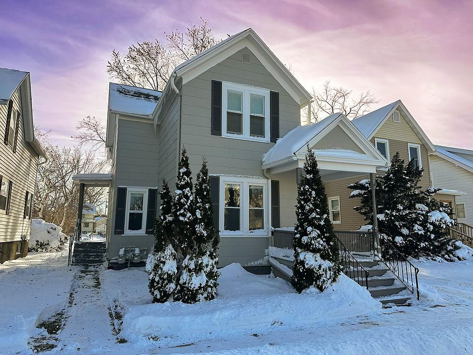 This 1,400+ Sq ft 4 BR 2 BA Duplex has been freshly painted inside and out, refinished maple hardwood floors on the main level, with updated quartz kitchen countertops! A great opportunity for a homebuyer looking to owner occupy a great future investment property. The upper unit is rented on a 1 year lease for $650 a month net lease, separate utilities, 2 furnaces, water heaters and electric services. Appliances in both units are included, 2.5 car detached 20x28 garage and full basement make this the right buy! Exterior : Slate Transite Siding