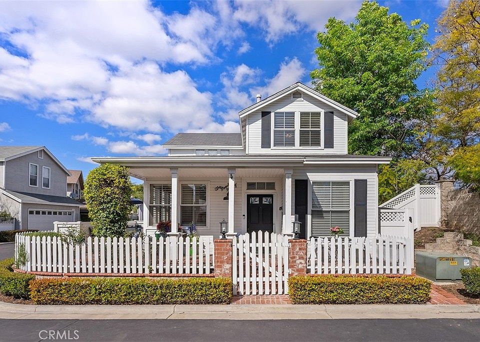 Beautifully updated turnkey home with corner lot in the sought after community of Ash Street Cottages. White picket fence, charming wrap around porch, and beautiful landscaping enhance the amazing curb appeal of this home. The entry leads you into the large living area with beautiful wood look laminate floors, tall ceilings, plenty of natural light, and gorgeous fireplace with custom tile surround and wood mantle. Updated Kitchen is open to living area and features quartz countertops, white cabinets, recessed lighting, gas range, stainless steel appliances, and in kitchen dining area. Area in living space closest to sliding glass door and staircase could also be used as formal dining if desired. Main floor also has a bedroom and lovely updated full bathroom. Beautiful staircase takes you to the second floor with newer carpet throughout, two additional bedrooms including Primary Suite, laundry area, and linen storage. Primary Suite features tall ceilings, shutters, and dual closets with wonderful custom closet organization system. Large primary bathroom has tile floors, bath tub, walk in shower, and dual sink vanity. Additional bedroom upstairs is spacious and has its own tastefully updated full bathroom with new vanity and quartz countertop. Laundry is conveniently located in closet of upstairs landing area. Beautiful gardenlike backyard has plenty of green grassy space, bright flowers, trees, newer vinyl fence, and raised planter area. Home has updated window coverings throughout including shutters and newer blinds and features several ceiling fans including one in each of the bedrooms. Garage has built in overhead storage and newer water heater. Community has sparkling swimming pool, spa, and parks/greenbelts to enjoy. Walking distance to downtown Brea which has plenty of options for shops, dining, and entertainment! Easy access to 57 freeway and Imperial Hwy. This is the one you have been waiting for!