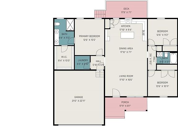 Country-like settingOne level homeOversized deckLarge center islandTile backsplashWhirlpool stainless steel appliancesPrimary suite