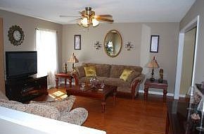 BETTER THAN NEW. Immaculate and well maintained home with over 1,900 finished square feet, 3-4 bedrooms, 2.5 baths, large living room, spacious kitchen with bar and brand new granite counters and tiles backsplash, dining room, family room/den and 2 car drive under garage. Great outdoor living space: large back deck overlooking the level backyard, almost acre lot and fenced-in backyard. Other highlights are: new hardwood flooring, neutral colors, ceiling fans, storage building, storm doors, master bedroom with private master bathroom and walk-in closet. Area is eligible for 100% financing through USDA