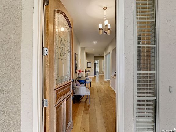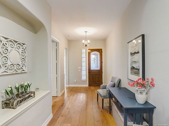 Beautifully maintained single-story home in the exclusive gated community of Roseheart, where comfort and convenience come together with an all-inclusive HOA that covers landscaping maintenance, garbage service, alarm monitoring, and access to exceptional amenities including a clubhouse, pool, tennis/pickleball courts, paved walking trails, and more. This thoughtfully designed home blends timeless charm with modern touches, offering true "lock and leave" ease. Inside, you'll find hardwood floors throughout, soaring ceilings, and a bright, open layout with flexible living spaces-perfect for entertaining or relaxing. A formal dining room or office adds versatility, while the spacious great room with a cozy fireplace opens to a screened-in back porch ideal for enjoying the outdoors. The kitchen overlooks the main living area and features solid wood cabinetry, granite countertops, a gas range, large pantry, and breakfast bar. The private primary suite offers a peaceful retreat with a double vanity, frameless glass shower, and a generous walk-in closet. Conveniently located with quick access to Loop 1604, I-35, and the airport, this home offers a low-maintenance lifestyle in one of San Antonio's most desirable communities. HOA includes: landscaping front and back, trash/recycle & alarm monitoring.