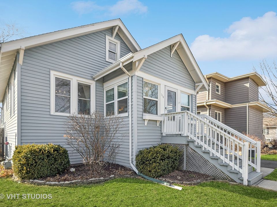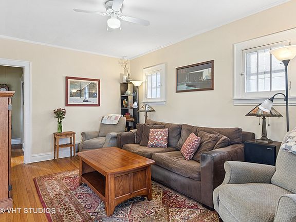 Move right into this warm and inviting 3-bedroom, 1-bath home! The enclosed front porch welcomes you into a space filled with charm and modern updates. Inside, gleaming hardwood floors flow throughout leading to a stylish, modern kitchen with white laminate cabinets, ceramic tile flooring, and newer stainless steel appliances, including a built-in microwave. The breakfast bar provides a cozy spot for casual dining, while the separate dining area is perfect for more formal gatherings. A full basement offers additional space, perfect for storage, a home gym, or a future recreation area. This home seamlessly blends charm and modern convenience. Enjoy the benefits of a two-car garage and a prime location close to the train, making commuting a breeze. Plus, the newly built Pick Park is just moments away-offering a fantastic outdoor space for recreation and relaxation. Don't miss this move-in-ready gem-schedule your showing today!