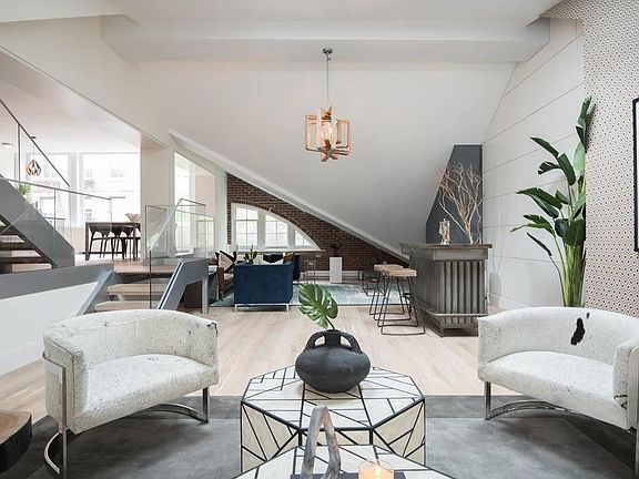 The Penthouse at 154 Spring presents the rare opportunity to rent a truly unique residence where pre-war beauty coincides with modern architecture. This deluxe triplex penthouse spans 4,131 square feet interior with an additional 875 square feet exterior across 2 private roof top patios. Accessed via a private keyed elevator, you are immediately drawn in by the expansive sunken living room accentuated by arched ceilings and multiple skylights. Ideal for entertaining, the living area is adjacent to the custom chef's kitchen complete with lava countertops, Artcraft cabinetry and Miele appliances. Continuing on through the main living space is a half bath and laundry room which is next to a separated king-size suite. One has the option of using the glass staircase or the private elevator to take you to the next level of the penthouse consisting of the second bedroom and massive master suite beaming with natural light throughout both bedrooms' wall of windows. The master suite features a windowed master bath finished with Waterworks fixtures and a Hastings free standing Chelsea Silk Tub. To top off this masterpiece is the third level of flowing open space which can serve multiple purposes such as a guest suite or office. Extended off of this third level are the two private patios with open city views from both northern and southern exposures.
