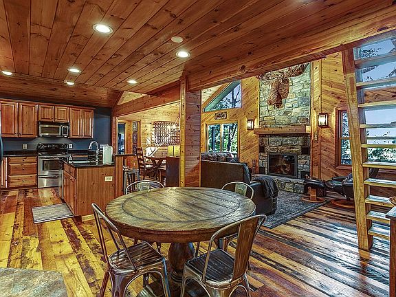 This beautifully renovated Beech Mountain home with views is located just 1/2 mile from slopes! With 5 bedrooms, 4 Bathrooms, 2900sqft of living space, 2 wood burning fireplaces, an outdoor fire pit, partial mountain views, and a creek this property might actually have it all. Inside you'll find a grand living room with vaulted ceilings, floor to ceiling stone fireplace and large sliding glass doors to its back deck. Out here you will find both open and covered areas for outdoor entertaining, complete with gorgeous mountain views. Back inside you'll find a large kitchen and dining area along with two master suites on main and a cute loft area with bunks. Additional rooms downstairs include a large game room with pool table, another living area with second fire place, 3 additional bedrooms and 2 additional bathroom. Property also features a beautifully done fire pit and additional lots with help provide so much privacy. Plenty of parking as well with upper and lower driveways. This property has huge rental potential for those looking for something that doubles as an investment. This is THE Beech Mountain home!