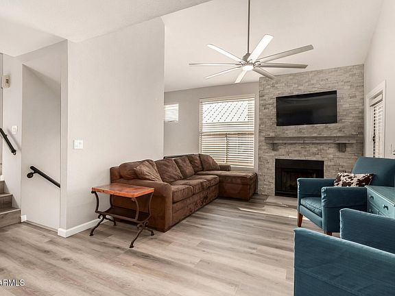 Don't miss this rare chance to own in one of Tempe's most desirable locations! This gorgeous 3-bed, 2-bath townhome in Hayden Square offers modern elegance in an UNBEATABLE LOCATION. Just steps from Mill Ave, ASU, light rail, and top dining, this is urban living at its finest. Recent remodel includes kitchen with sleek finishes, new cabinetry and appliances, plus upgraded bathrooms with contemporary fixtures. Fresh paint, new lighting, and stylish hardware enhance the bright, airy feel. Vaulted ceilings and stone fireplace bring character to the open living area. The main-level bedroom and two spacious upper bedrooms offer flexibility for guests, a home office, or extra living space. Enjoy a private balcony overlooking the pool and spa, ample storage, secure parking, and most utilities.