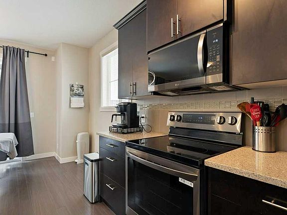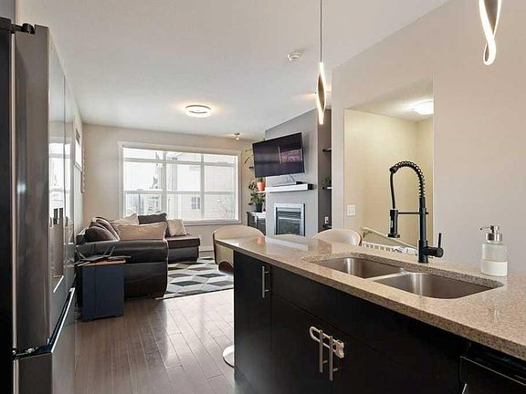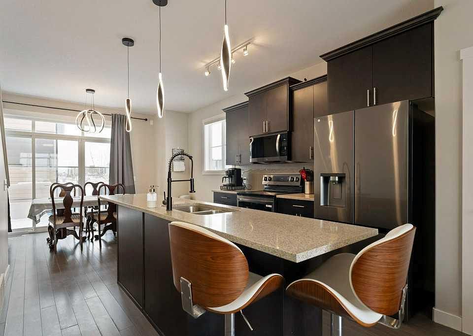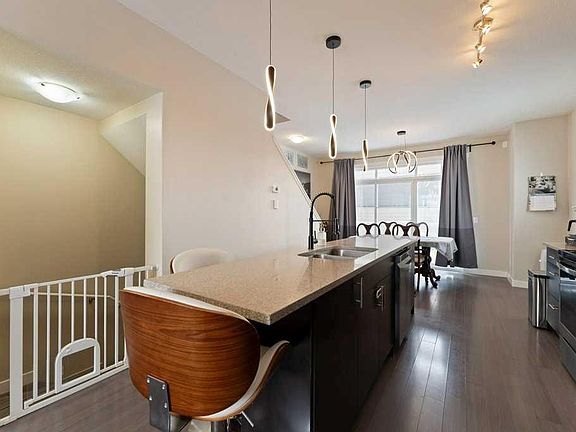 Nestled in the vibrant Community of Redstone, this stunning 2-bedroom, 3-bathroom end-unit townhouse offers a bright, airy sanctuary bathed in natural light from its abundance of extra windows, perfect for those who cherish sunlit spaces and SPECTACULAR MOUNTAIN VIEWS. Step into the ground floor, where a spacious front entry welcomes you alongside a versatile office or recreation area, ideal for unwinding or working from home. Convenience reigns here with a 2-piece bathroom for quick touch-ups, a utility room with new hot water heater, and the OVERSIZED ATTACHED HEATED GARAGE provides ample storage while featuring a handy water tap for effortless cleaning of outdoor items—making everyday chores a breeze. Ascend to the second floor, greeted by elegant laminate HARDWOOD FLOORING that flows seamlessly into the heart of the home: a chef's dream kitchen boasting rich dark cabinetry, luxurious QUARTZ COUNTERTOPS, and gleaming STAINLESS STEEL appliances, including NEW REFRIGERATOR, STOVE, and DISHWASHER. The expansive island invites casual seating at both ends, fostering easy conversations during meal prep, while the adjacent family-sized dining area captivates with its huge windows and patio doors spilling onto a generous deck with GAS LINE for you BBQ—perfect for savoring eastern exposures and those serene morning coffees as the sun rises. Cozy up in the adjoining awesome living room, where a GAS FIREPLACE crackles invitingly beside CUSTOM BUILT-IN CABINETS, creating an intimate yet open gathering spot for family and friends. Upstairs, retreat to the tranquil MASTER BEDROOM with MOUNTAIN VIEWS—a wonderful haven complete with a 4-piece ensuite and double closets for all your wardrobe needs. The second spacious bedroom shares this level with another full 4-piece bathroom, ensuring privacy and comfort for guests or growing families. Rounding out this thoughtfully designed floorplan is a dedicated laundry and storage room, keeping life organized and stress-free. With its modern finishes, intelligent layout, and community perks including a pond with panoramic west-facing views of the mountains and downtown skyline, close proximity to schools and transportation routes, and quick access to downtown via major highways—this Redstone gem is more than a home, it's a lifestyle upgrade just waiting for you.