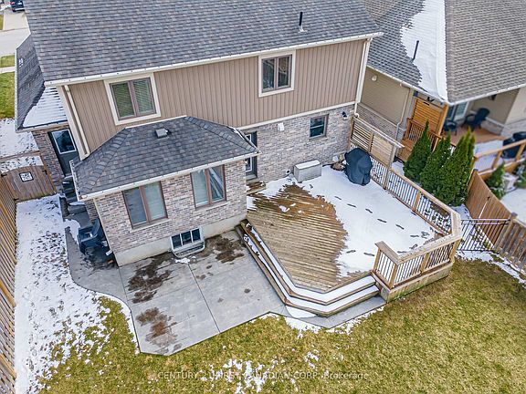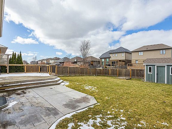 Welcome to the charming town of Lucan, a vibrant and growing community offering all the amenities you could need while being just 15 minutes from London and 25 minutes from the shores of Lake Huron. This beautiful home, built by Colden Homes, showcases the popular Morrison Plan and delivers an efficient, comfortable layout. As you step through the front door, you are greeted by a spacious foyer, leading into a serene and welcoming atmosphere. The large dining room flows seamlessly into the expansive kitchen, featuring newer stainless steel appliances, custom-built pantry, subway tile backsplash, and elegant white shaker cabinets. A massive island anchors the space, creating a perfect spot for entertaining family and friends. The light-filled living area centers around a striking floor-to-ceiling stone fireplace, complemented by a rustic wood mantel that adds warmth and charm. The main floor also offers a conveniently updated 2-piece bathroom, a sizable mudroom with direct entry from the double car garage, and a rear door leading to the backyard-ideal for your furry friends to roam freely. Heading upstairs, you'll find a beautiful accent wall that extends from the first floor to the second, adding visual interest to the space. A generous landing leads to four well-sized bedrooms, including a spacious primary suite featuring vaulted ceilings, a large picture window, walk-in closet, and a luxurious ensuite with double sinks and a glass shower. An additional 4-piece bathroom serves the other bedrooms. The unfinished basement presents excellent potential for future development with a rough-in for a bathroom and large egress windows. The fully fenced backyard is perfect for outdoor living, offering an expansive deck, stamped concrete pad, and a shed for extra storage. Located just steps from Elm Park, with a splash pad, and close to the new grocery store, shopping center, and Wilberforce Public School, this home offers exceptional value and an unbeatable location!