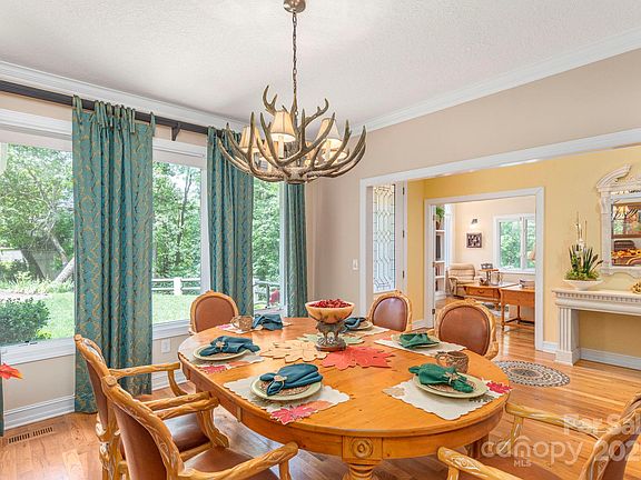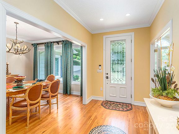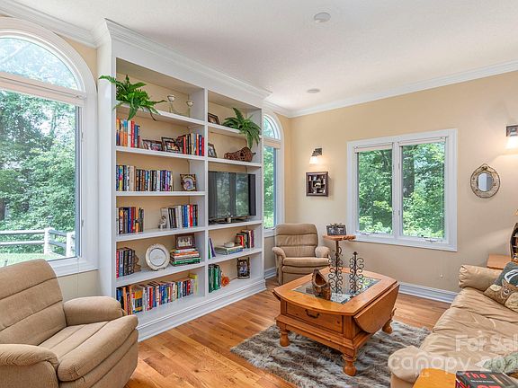 This stately, classical style residence offers the perfect blend of sophistication & comfort, while having the convenience of one level living. Step into this custom-built home that features a library with built-ins & crown molding. Beautifully appointed kitchen awaits your culinary creations & separate butler’s pantry for additional storage, while helping to make entertaining a breeze! Dining area flows into a spacious great room w/cathedral tongue & groove ceiling, built-ins & fireplace. Enjoy a wonderful entertainment area, just off the great room, complete with a bar & game area, ideal for hosting gatherings. Step onto the expansive back deck & patio area to find a serene water feature plus an outdoor fireplace, perfect for relaxing! Luxurious primary suite w/an adjacent office. Split floorplan with 2 Guest Bdrms on main level, separated by a full bath. There is a lower level workout area/bonus area & 2nd ensuite. Located in Foxfire Estates, minutes to Lake Junaluska & downtown Waynesville. City Water & City Sewer but No City Taxes
