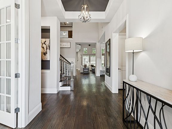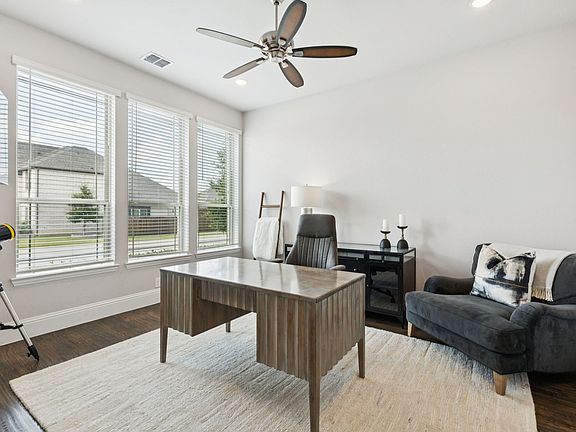 This beautifully appointed home blends Bloomfield's superior building quality with the owners custom upgrades- creating a truly better than new living experience. Step inside to hardwood floors, designer lighting, and a private home office just off of entry. A first floor guest suite with custom wall and window treatments and a full bath.The heart of the home is the open concept living area, where the dining, living, kitchen and outdoors flow seamlessly together. The wood beamed ceiling and Juliette balcony overlooking the living room add architectural character. The kitchen boasts a 5 burner gas cooktop, double ovens, pot filler, granite countertops, wood cabinetry, and a large walk in pantry, while a nearby bar nook makes entertaining effortless. The primary suite is a serene retreat with a sitting area, custom electric window treatments, designer wallpaper and a spa inspired bath. Upstairs you will find a spacious media room and flex space. Additional bedroom and full bath. Open the sliding doors to a covered balcony overlooking the low maintenance all turf backyard. Conveniently located near shopping, dining, and golf. Easy access to Dallas North tollway. Enjoy the perfect blend of luxury living and small town charm. Award winning Prosper ISD.