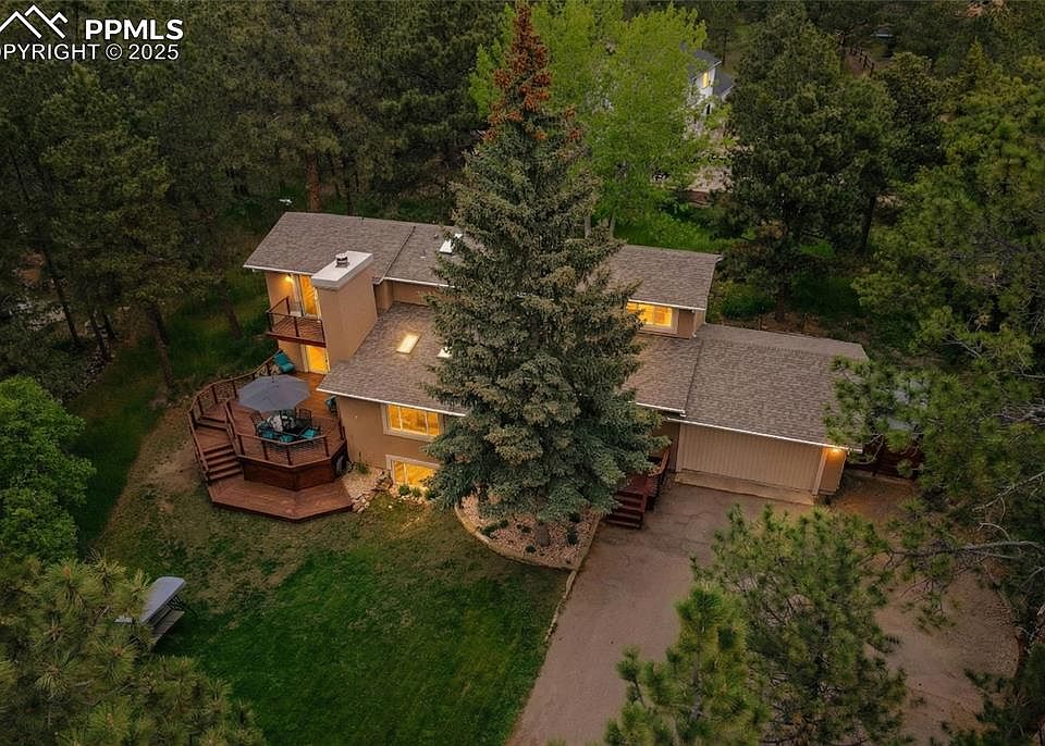 Nestled on a private 0.64-acre wooded lot surrounded by towering ponderosa pines, this 5-bedroom, 3-bath two-story home is vacant, refreshed, and move-in ready. Vaulted tongue-and-groove pine ceilings and a striking brick fireplace with built-in shelving create an inviting Colorado mountain atmosphere. Recent updates include brand-new carpet throughout, new roof, and freshly stained 1,000+ sq ft redwood decking. The remodeled kitchen showcases white shaker cabinetry, concrete countertops, stainless appliances, and travertine-style tile flooring, flowing seamlessly into the dining area. The primary suite offers a private deck for morning coffee among the trees, walk-in closets, and en-suite bath with dual vanities and tiled shower. Main-level bedroom and laundry add everyday convenience. Over 1,000 sq ft of multi-level redwood decking wraps the home—ideal for entertaining, grilling, or watching kids explore the expansive wooded yard. The finished basement (1,000+ sq ft) delivers exceptional flexibility with a spacious family room featuring luxury vinyl plank flooring, private office with window and closet (perfect for remote work), guest bedroom, and full bath. Located minutes from Monument's top-rated Lewis-Palmer District 38 schools, shopping, dining, and I-25 access. This peaceful, private retreat delivers true Colorado living with unbeatable convenience. VACANT, move-in ready, easy to show—don't miss this opportunity with exceptional seller incentives!
