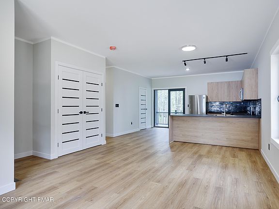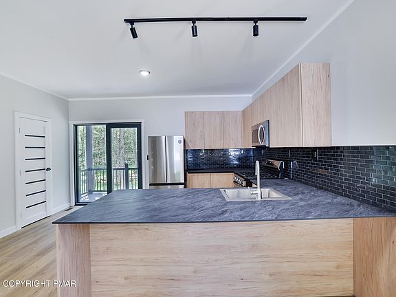 Stainless steel samsung appliancesLarge pantryOpen conceptSleek vertical sidingClose by the lakeHigh end laminate flooringModern and functional kitchen