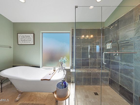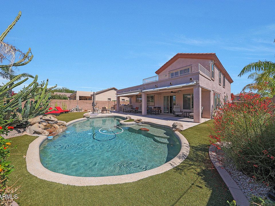 Your Private Desert Oasis Awaits! 4 bedroom, 3 bath, 2,839sf tastefully updated home within the sought after east valley community of Sierra Heights. At arrival you'll notice the cut-de-sac lot, mature landscaping, extended driveway and 3 car garage. Upon entry the Family Room's vaulted ceiling, stone accents and mix of travertine tile & wood flooring will invite you in. Chef's kitchen boasts granite counter tops, subway tile backsplash, wood cabinetry, island w/snack bar, stainless appliances, r/o system, large breakfast nook and a picture perfect pool view. Bonus/game room with built in shelving/cabinets, natural lighting and backyard access is the perfect space to play and entertain. Downstairs you will also find a guest bedroom with... ...shelving/cabinets, wood shutters and extra wide closet located across hall from a full guest bathroom w/crown molding. Head up the extra-wide staircase w/classic white wood banister to find the Owner's Suite, 2 additional guest bedrooms, full guest bathroom w/tile tub surround, hall flex space and outdoor viewing deck. Owner's Suite has it all, vaulted ceilings, wood shutters, glass enclosed shower, freestanding soaker tub, dual sinks, granite countertops, privacy room and walk-in closet with build in organizer. Backyard is a "must see to believe" whether you are looking to entertain friends/family or relax solo while listening to the soothing sound of water cascading down the rock waterfall. Backyard features include PebbleTec heated pool, travertine patio decking, large covered patio w/extender shades, ceiling fans, gas fire pit, built-in grilling area, natural gas pool heater, misting system, artificial turf and easy care mature landscaping. Other home features include, formal dining room, security screen at entry, RV style side gate, whole house water softener, garage cabinets and laundry room w/2nd refrigerator. Located just a short distance to hiking trails, golf courses, spring training baseball, Salt River, Saguaro Lake, parks/playgrounds, dining, shopping and entertainment. Welcome Home!!!