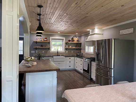 Loft roomOpen floor designStainless steel appliancesFarmhouse sinkCustom kitchen cabinetsHigh ceilingsPond with a dock