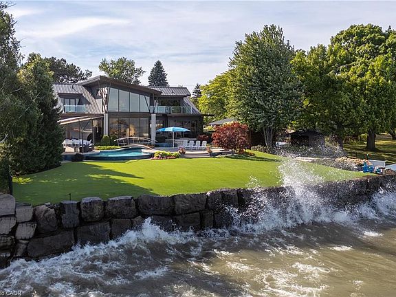 1540 Watersedge Road is a spectacular waterfront estate with jawdropping Toronto skyline views. Modern, private, and completely reimagined with extensive updates on all 3 levels and the exterior, including roof, flooring, staircase, automation, lighting, interior decor, redesigned garage and pool, with exterior landscaping including maintenance free lawn. Every element was designed to capture skyline views, natural light, and a lifestyle without compromise. Set on 0.6 acres along Lake Ontario, the residence showcases bold lines of glass, stone, and steel. Inside, walls of windows frame water and city vistas from every angle. The great room commands attention, anchored by a striking 360-degree fireplace. Heated floors and an elevator to all levels ensures both luxury and ease. A NEFF kitchen with pantry and laundry area balances style and function. The main-floor principal bedroom offers a spa-inspired ensuite and direct walkout to the deck. A versatile flex room, ideal as a gym or office, enhances the living space. Upstairs, three bedrooms with ensuites provide privacy and flexibility- two with terraces that extend directly to sweeping lake views. The lower level is designed for entertainment, featuring a home theatre, games lounge, secondary kitchen for catering and snacks, and guest suite. For the car enthusiast, the garage is exceptional, with epoxy flooring, custom cabinetry, and parking for six vehicles. Outdoors, the property becomes a private resort. A reimagined infinity-edge pool and spa by Gibson Pools stretches toward the horizon. Multiple terraces, dining areas, and lounging spaces are surrounded by perennial gardens and architectural features, blending beauty with simplicity.1540 Watersedge Road is a rare opportunity: a refined estate for contemporary living, equally suited for epic entertaining, where design, privacy, and breathtaking views meet on the lakefront. LUXURY CERTIFIED.