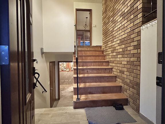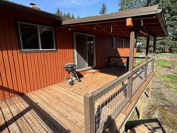 Two level brick fireplaceLots of storageGreat covered back deckWood stove insert