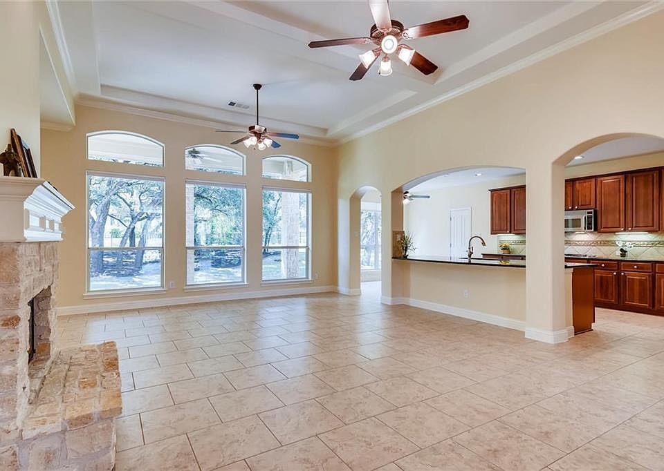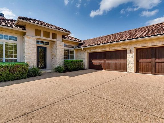 This stunning 4/3.5 one story stone and stucco ranch style home in Falconhead/Spillman Ranch shows like new, with great features and fabulous floorplan! Open and bright with extensive tile and new carpet (6/19) in the bedrooms; split formals at the front and a spacious family roof/kitchen/breakfast area all open to each other. Tall arched wall of windows look out to the generous sized backyard (lot is .51 of an acre.)Black granite kitchen features 42" gorgeous cherry cabinets, stainless appliances, recessed lighting, and an oversized granite/breakfast bar that adjoins the kitchen to the living area. MIL plan with recessed ceiling in master suite, glass blocks in master by tub, separate shower and hard surface counters. Three other spacious bdrms on the other side of the house -good privacy for the homeowner, and 3.5 baths. Archways, crown moldings, high ceilings, rounded corners, fresh int paint, beautiful golf course community. Tiled roof, 3 car side entry garage. A real prize!