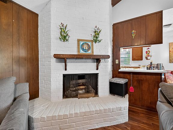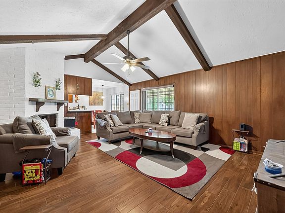 White brick fireplaceExpansive backyardTidy mulched garden bedOpen kitchenCovered patioPrivacy brick wallExposed beam ceilings