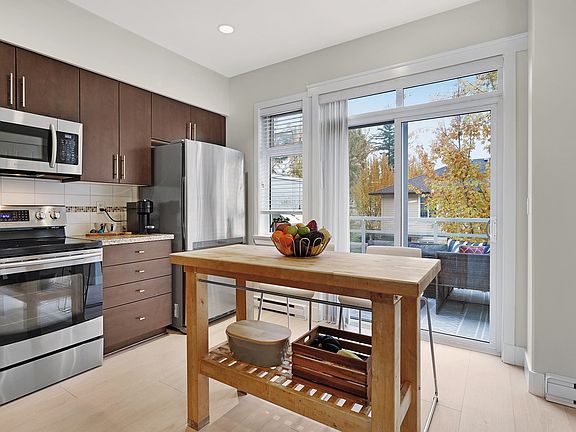 Welcome to a beautiful townhome at Nuvo II! Stylish 2–3 bedroom home with a private treed outlook. The entry level offers a flexible bedroom or office (zoned for work), 2 piece bath, and access to a fenced yard. The bright main floor features an open-concept layout with a chef’s kitchen - rich wood cabinets, granite counters, stainless steel appliances, and a large pantry. Enjoy an oversized, private balcony perfect for relaxing or entertaining. Upstairs boasts two spacious bedrooms, each with its own ensuite. Single garage with extended covered driveway for extra parking. Excellent outdoor areas on the deck and downstairs patio. Central location close to shopping and quick Highway 99. School catchment is Rosemary Heights. A short walk to Morgan Crossing.