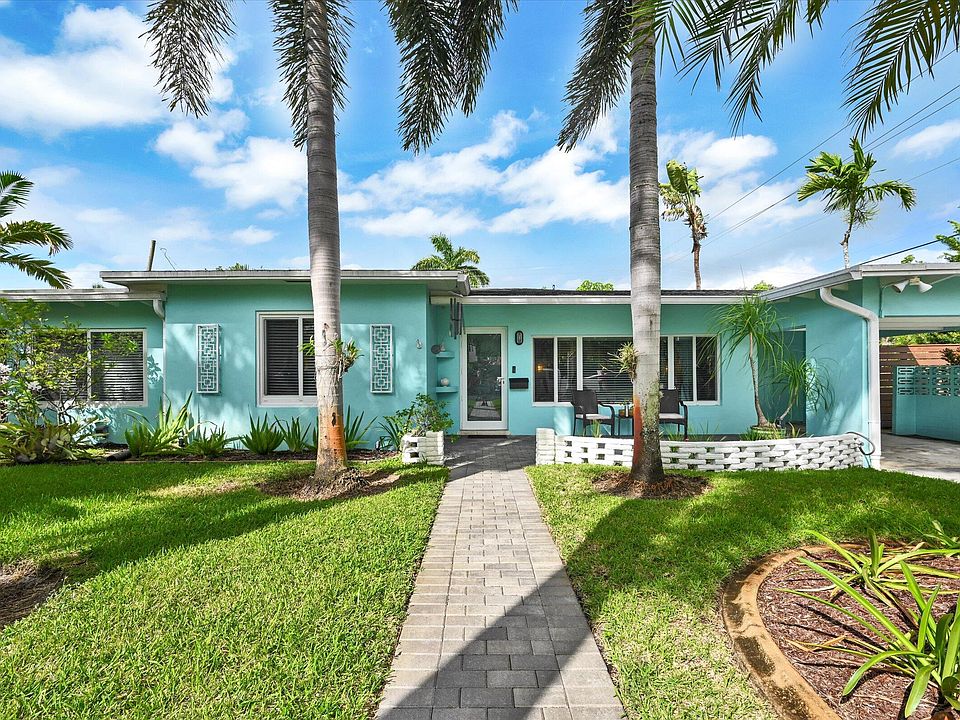Stunning mid-century 3 bedroom 2 bath pool home with amazing curb appeal, set on a coveted corner lot in Poinsettia Heights. Majestic royal palms line the front of the house, complementing lush landscaping and a sparkling pool. Bright interiors flow to tropical outdoor spaces designed for entertaining and true Florida living. Major updates include hurricane impact windows and doors, updated kitchen with stainless steel appliances & resurfaced pool (2018), new driveway & pavers (2021), east facing fence (2021), A/C (2020), and full PVC sewer line replacement (2023). Centrally located - minutes from the beach, downtown, dining, airport, and major highways. This move-in ready gem blends timeless style with modern comfort in one of Fort Lauderdale's hottest neighborhoods.