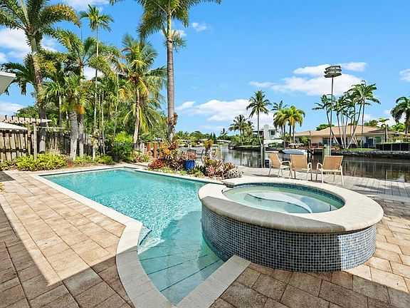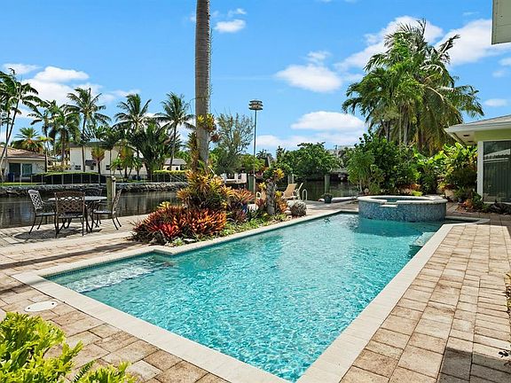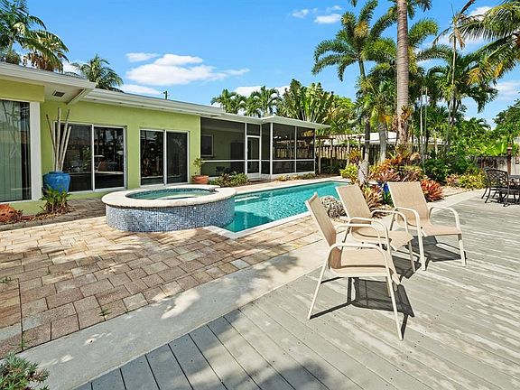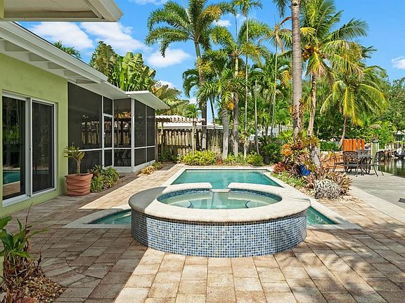 Lowest priced waterfront pool home in East Wilton Manors. 3 bedrooms and 3 full bathrooms with 2 primary suites, 87 feet of waterfront, a new roof in 2022, and a garage. Situated in a lush tropical garden with many fruit trees and palms, this home has tranquil relaxing long distance views of the North Fork of the Middle River. The screened porch overlooks the heated salt pool and spa whose equipment was replaced in 2022.
