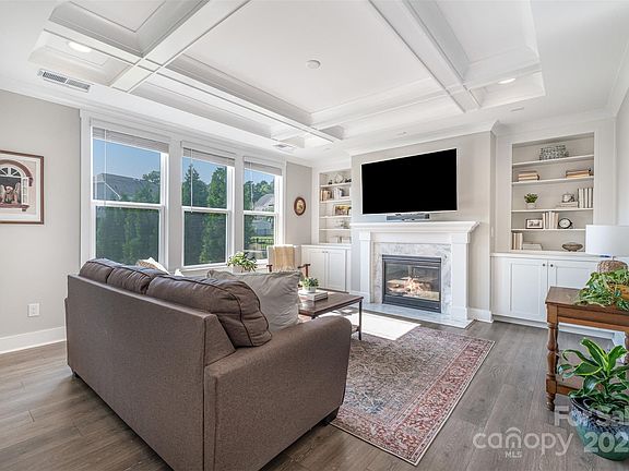 15413 Keyes Meadow is a single story home with knockout features! This popular pikewood plan showcases high-end finishes and an open, light-filled floor plan anchored by a gourmet chef’s kitchen with an oversized island, gleaming white quartz countertops, picket tile backsplash, stainless steel appliances, double pantries, gas range with hood, and a beverage fridge. With extensive counter space and abundant storage, it’s the perfect heart of the home. The kitchen flows seamlessly into a sunny breakfast nook and out to a screened porch—ideal for effortless indoor/outdoor entertaining. The great room impresses with a gas fireplace, custom built-ins, and a coffered ceiling, offering an inviting gathering space. The primary suite is a retreat of its own, featuring tray ceilings, a custom walk-in closet, and a spa-like bath with dual vanities and a spectacular tiled walk-in shower. Generously sized secondary bedrooms with private baths make guests feel right at home. A bright study/office with French doors offers versatility to fit your lifestyle. Step outside to your private backyard oasis—complete with a large fenced yard, stamped concrete patio, gazebo, lush privacy trees, and garden beds—perfect for relaxing or entertaining year-round. Walden is a super friendly neighborhood that has a multitude of activities like community gatherings, holiday clubhouse + pool, playground and walking trails. Close to downtown Huntersville, Birkdale village, I-77 and more!