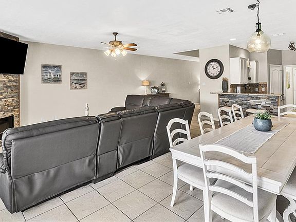 Recently updated with a new roof (July 2025), the home is move-in ready and beautifully maintained. Inside, you’ll love the open concept living, dining, and kitchen areas, all overlooking the sparkling canal. A striking slate stone fireplace creates a warm focal point in the living room, while the kitchen shines with granite counters, a tile backsplash, walk-in pantry, and a breakfast bar wrapped in natural stone.
