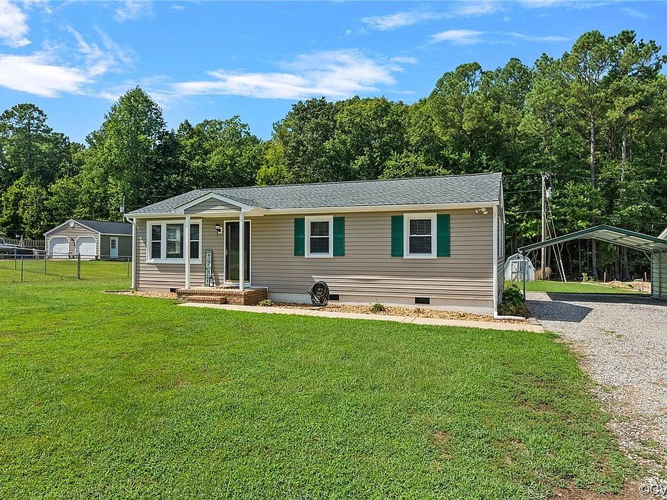 Welcome to this cozy 3 bedroom, 1 bathroom rancher on a large, flat, open lot. This home has vinyl siding for easy maintenance & energy-efficient vinyl windows. The new roof (2022), adds to the home’s durability and appeal. Inside you’ll immediately appreciate the inviting ambiance created by the hardwood floors in the living room, hallway, and one of the bedrooms. The living area provides an abundance of natural light & a comfortable space for relaxation. There is fresh paint throughout and the bathroom showcases an upgraded vanity. Gather around the table in the eat-in kitchen which has versatility and an efficient layout. The expansive deck with built-in seating makes it easy to entertain guests. Enjoy the large back yard that is perfect for gardening, outdoor games, grilling, and hanging by the fire pit. Enjoy a double width driveway with large 2-car carport. A generous shed with electricity is perfect for tools and equipment. Enjoy the country setting and quiet neighborhood off of River Road, providing a quick commute to the Chesterfield Government Complex, Colonial Heights, Hull Street, & Chester. Enjoy the outdoors at nearby Lake Chesdin and Pocahontas State Park.