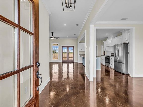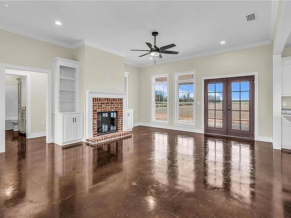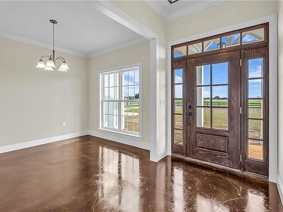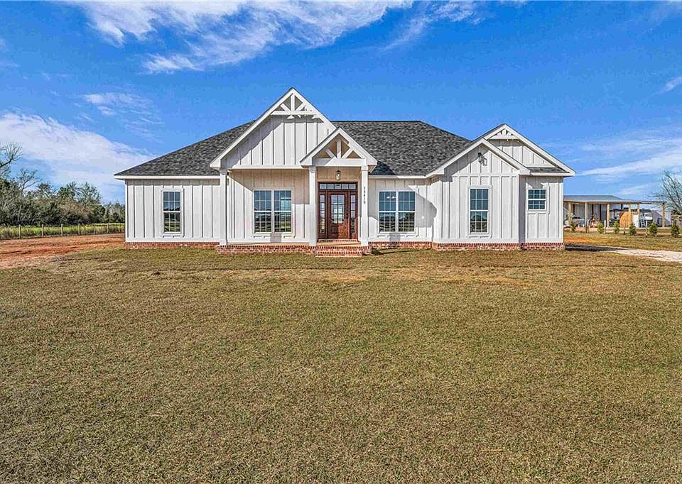 Stunning new construction custom home on 5.2 acres! This thoughtfully designed 3-bedroom, 2.5-bath home with a dedicated office offers a comfortable and functional layout ideal for everyday living. The kitchen and baths feature beautiful painted cabinetry paired with granite countertops, while crown molding and an electric fireplace enhance the main living spaces. A built-in drop zone adds everyday convenience, and the covered porch is ideal for relaxing. Large windows invite natural light and showcase the serene surroundings, creating a seamless connection between indoor living and the peaceful outdoor setting. The primary suite offers a comfortable retreat with dual vanities, a walk-in closet, tile shower, and a freestanding soaking tub. A separate dining room provides an ideal space for entertaining and gatherings. The property also includes a 30x50 pole barn, offering ample space for storage, hobbies, or equipment. Enjoy the freedom of NO HOA, all while being located in an area with a country feel yet close to everything. This home is less than 3.5 miles to the hospital, minutes to shopping and dining, and just 16 miles to the Gulf Coast’s white-sand beaches. A rare opportunity to enjoy space, comfort, and convenience in a custom new home! Buyer to verify all information during due diligence.