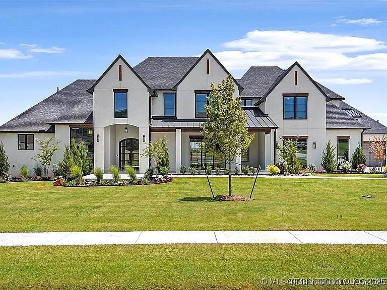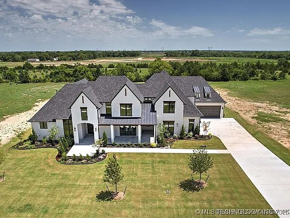 Located in Whisper Lane, an exclusive gated community in Bixby West school district, this home offers luxury and elegance on a 1-acre lot. The expansive front elevation and stunning pool with spa, tanning ledge, and waterfall can be seen from the living room, primary suite, bonus room, and exercise room. Features include vaulted ceilings, a gourmet kitchen with a 48-inch commercial range, dual dishwashers, and scullery. The primary bath connects to a