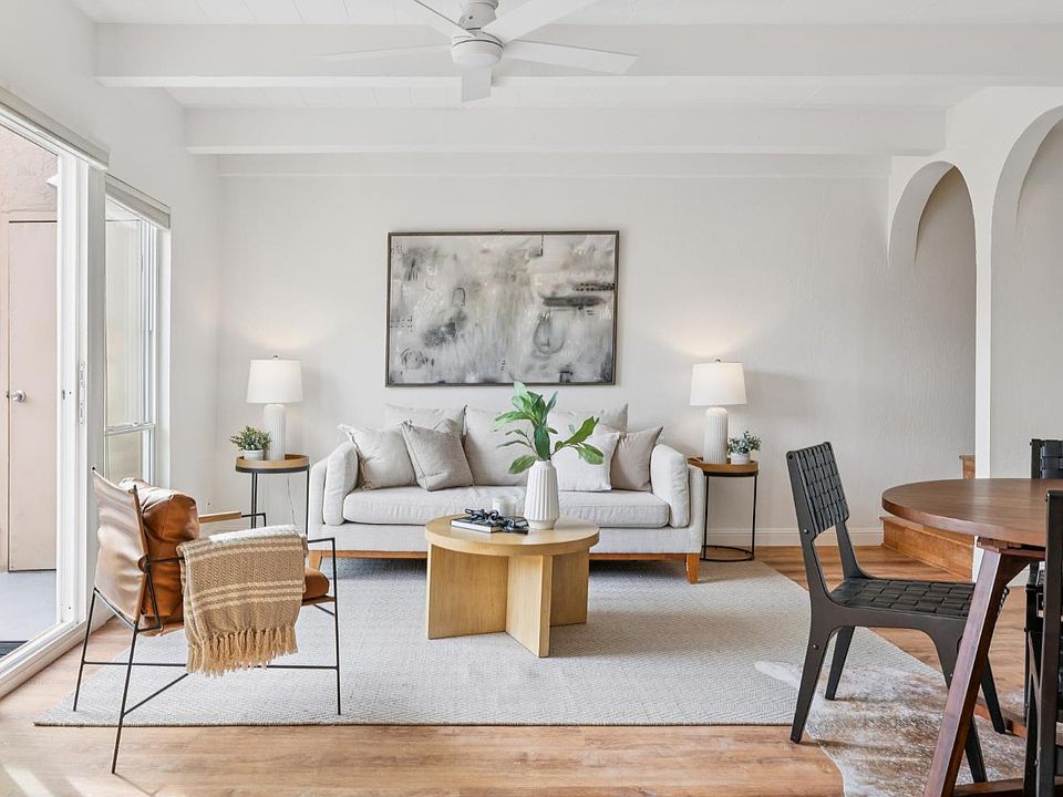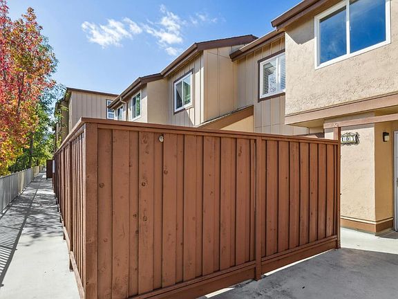 Discover this beautifully refreshed two-level townhome offering a seamless blend of comfort, light, and modern design. This home is positioned on the southeast corner of the community, offering optimal sunlight, privacy, and quiet. A nearby gated garage entrance adds everyday convenience. The spacious main level welcomes you with an open-concept living and dining area, highlighted by brand new luxury vinyl flooring, crisp white walls, and sliding glass doors that open to a large private patio, perfect for outdoor lounging or a container veggie garden. The updated kitchen features quartz countertops, stainless steel appliances, and shaker-style cabinetry, while the convenient half bath includes an in-unit washer and dryer. Upstairs, two bright bedrooms offer generous closet space, including a walk-in, and share a full bath with new flooring in the primary suite. Additional features include one dedicated covered parking space, a patio closet, and extra on-site storage for owner belongings. Enjoy comfort and convenience with access to a sparkling pool, spa, lush greenbelts, and on-site laundry facilities. Centrally located near shopping, dining, parks, and transportation, this home offers the perfect balance of tranquility and ease within a well-maintained community.