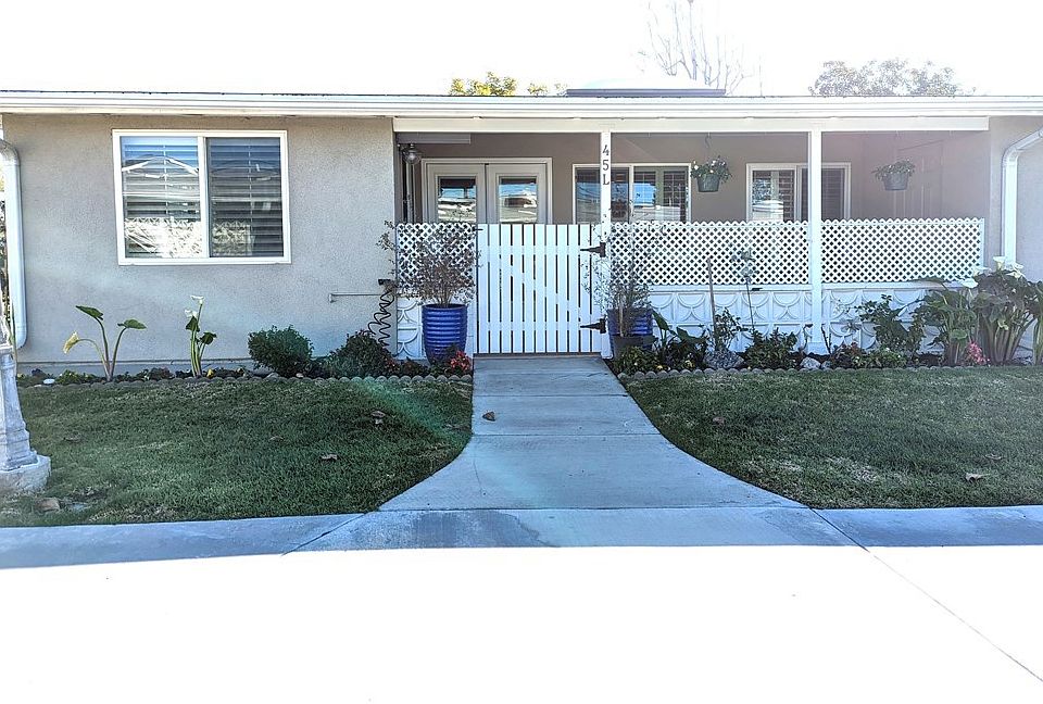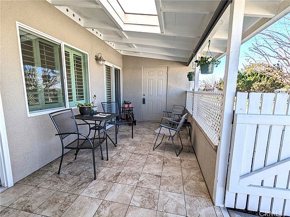 (M2-45L)(Carport 37, Space 37); Exceptional Greenbelt Corner Unit; Recently updated with open concept floor plan, modern finishes, double-entry doors with blinds between glass, energy-efficient windows, energy star rated appliances, and led lighting; Interior Shutters, White Shaker Cabinets, Quartz Countertops, Farmhouse Sink, soft close cabinets, Fluted kitchen skylight that opens, Newer Appliances, Stackable Washer Dryer, Laminate Floors; Zoned heating and cooling with heat pump splits; Bedroom 1 has sliders to patio; Ensuite Bedroom 2 with walk-in closet, dresser inset, and recessed lighting; Dining Room with office alcove, coast closet, pendant chandelier, recessed lighting, large skylight, office and sliding door to entry patio; Covered entry patio with non-skid tile, skylight, custom storage closet, shelving, electrical outlet, and interior light; Side patio overlooks greenbelt with a concrete pad which is great for a bistro set or ready for mutual allowed patio expansion; This unit is move-in ready and redesigned for modern living, Steps to downtown - clubhouse, gym, cafe, pharmacy, amphitheater, swimming pool; 9 hole - par 3 golf course and Administrative services building.