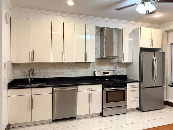 Kitchen includes stainless steel refrigerator, dishwash, and stove