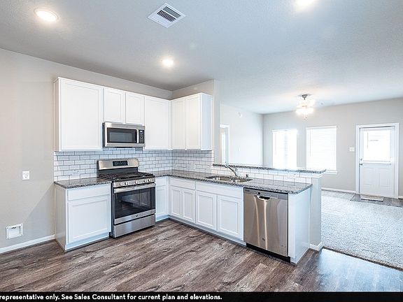The Oak is a spectacular home boasting three bedrooms and two bathrooms, the perfect essential layout for most any lifestyle.. Upon entering the stunning Oak plan, feast your eyes on the inviting formal dining room - perfect for hosting dinner parties or having your whole family come together for the holidays. Beside your formal dining room rests your convenient walk-in utility room with direct access to your spacious two-car garage. Toward the right wing of the home is your second and third bedrooms accompanied by the full secondary bathroom residing between the two bedrooms. Travel further throughout the home and you will find the flexible kitchen area that opens up to the family room, so you will never have to miss out on any moment with guests. Your kitchen comes equipped with sleek granite countertops paired with a ceramic tile backsplash, gorgeous flat-panel birch cabinets, industry-leading appliances, and stylish designer light fixtures. Conveniently attached to your family room is access to the backyard and the optional covered patio - perfect for relaxing outdoors and embracing the surrounding nature. Retreat to your private master suite, where you will discover cultured marble countertops, a super shower, and a walk-in closet. This well-designed plan is filled with energy-efficient features that keep you and your family's comfort at the forefront. Features like low E3 cube windows, third-party inspected insulation, and high-efficiency lighting all work together thro