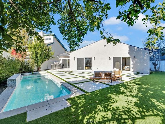 Nestled in a quiet cul-de-sac in one of Encino's most desirable neighborhoods, this beautifully remodeled and expanded residence offers 3 bedrooms, 3.5 bathrooms at 2,100 sqft. The main home features a spacious open layout with seamless flow from the living room to the dining area and chef's kitchen, complete with top-of-the-line appliances and a fireplace overlooking the entertaining space. A laundry room with a stackable washer/dryer and ample storage sits just off the kitchen. The primary suite overlooks the pool and includes a custom walk-in closet and spa-like bathroom with dual sinks and elegant finishes. Two additional bedrooms and bathrooms complete the main house. Sleek doors open to the manicured backyard, where a sparkling pool, outdoor seating area, and BBQ provide the perfect setting for indoor-outdoor living. Pool and gardener maintenance are included in the lease. Additional highlights include internal and external security cameras, a Ring system with a panic button, and the option for a backyard shed for extra storage. Located in the sought-after Hesby Oaks Charter School district, with easy access to freeways, local parks, and Ventura Boulevard's shops and restaurants.