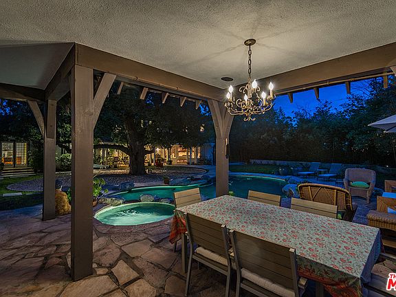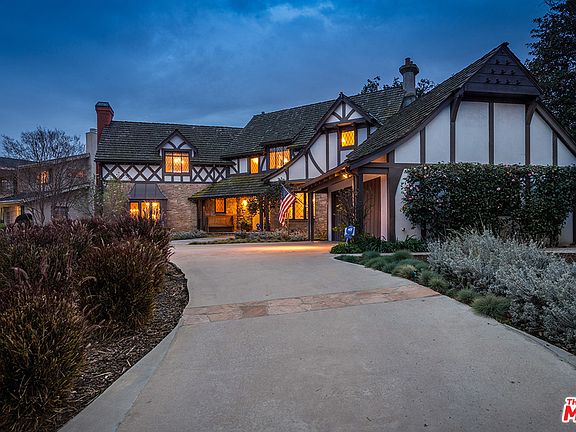 Custom Sherman Oaks English Tudor offers fine craftsmanship for upscale tastes, from exposed ceiling beams and diamond-paned leaded glass, to elegant moldings and peg & groove floors. An authentic stone & half-timber exterior with a circular motor court leads to an inviting entry. Welcome guests to the dining room & formal living room with paneled accent wall, grand fireplace and coffered ceiling. Enjoy a beverage by the warmth of a fire in the paneled library where a tufted leather Dutch door reveals a galley bar with hammered copper sink, leaded glass cabinets & frig. The charming kitchen flows into a sun-filled breakfast nook. Each spacious bedroom includes an attached dressing room & en suite! Store seasonal blankets & clothing in the cedar closet. Beautiful leaded glass French doors throughout the home open to spectacular grounds. The salt-water pool & spa, gazebo and BBQ area are set amid flagstone patios. Separate bathroom conveniently located near pool area.