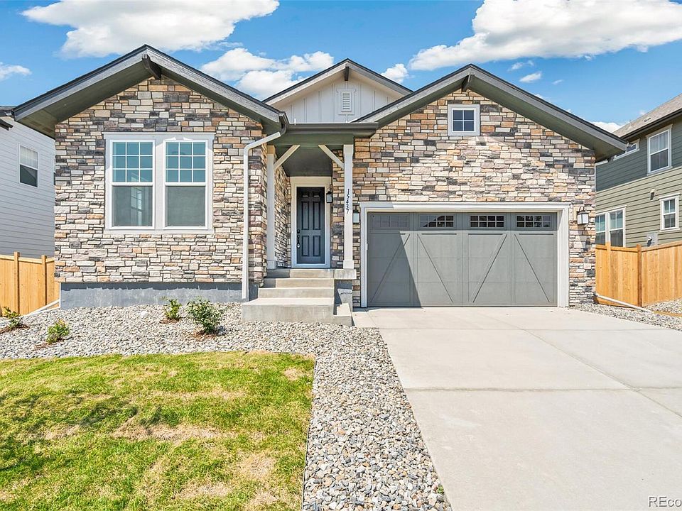 Stunning ranch-style home featuring 3 bedrooms, a dedicated office, and an open-concept layout perfect for modern living. Enjoy luxury vinyl plank flooring throughout, espresso cabinets, white quartz countertops, and a white picket backsplash. The spacious great room is highlighted by a black marble tile fireplace and flows seamlessly into the kitchen and dining areas. Modern horizontal railing leads to a partial unfinished basement, offering room to grow. Stylish, functional, and move-in ready!