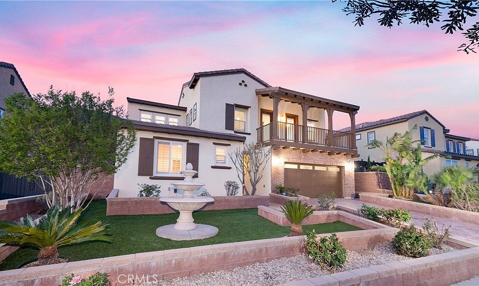 Located in the heart of the highly sought-after Avellino community in North Fontana, this home offers the perfect blend of comfort, elegance, and practicality. Every room is thoughtfully designed to embody modern luxury, with attention to detail and quality finishes throughout. As you approach the home, you're welcomed by an inviting stamped concrete driveway that leads to a spacious 2-car garage. The water-efficient, low-maintenance landscaped yard beautifully frames the property, while a charming balcony graces the front of the house, offering a serene spot to take in the surroundings. Upon entering, you're greeted by rich engineered wood flooring that stretches across the open-concept floor plan. The family room, featuring a cozy fireplace and a well-appointed wall unit for additional storage, creates a perfect balance of expansive living space and comfort. The kitchen, the heart of the home, is designed for both functionality and style. It boasts a large center island, a 5-burner cooktop with a powerful range hood, a built-in oven and microwave, a refrigerator, and a spacious walk-in pantry. Just nearby, a dedicated office space with built-in desks and cabinetry offers a peaceful retreat for work or study. Conveniently located on the first floor, a guest bedroom and bath with a walk-in shower is perfect for hosting overnight visitors or accommodating in-laws, offering both comfort and privacy. Upstairs, a large loft area opens to the front balcony, providing a versatile space. The luxurious primary suite is a true sanctuary, complete with a private balcony offering stunning mountain views. The suite also features a spacious walk-in closet with custom-built-in organizers, ensuring ample storage. The primary bathroom includes a separate walk-in shower, a jetted soaking tub, and dual sinks. The backyard is designed for both relaxation and entertainment, with a California Room that features a ceiling fan for added comfort. The stamped concrete surrounding the space offers easy maintenance, while creating an ideal setting for outdoor gatherings or quiet moments of retreat. Every detail of this home has been carefully crafted, from the elegant engineered wood flooring and recessed lighting to the crown molding, plantation shutters, and custom cabinetry. The result is a space that seamlessly combines beauty and functionality, creating a home that is as practical as it is stunning.
